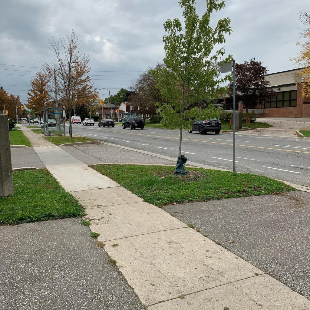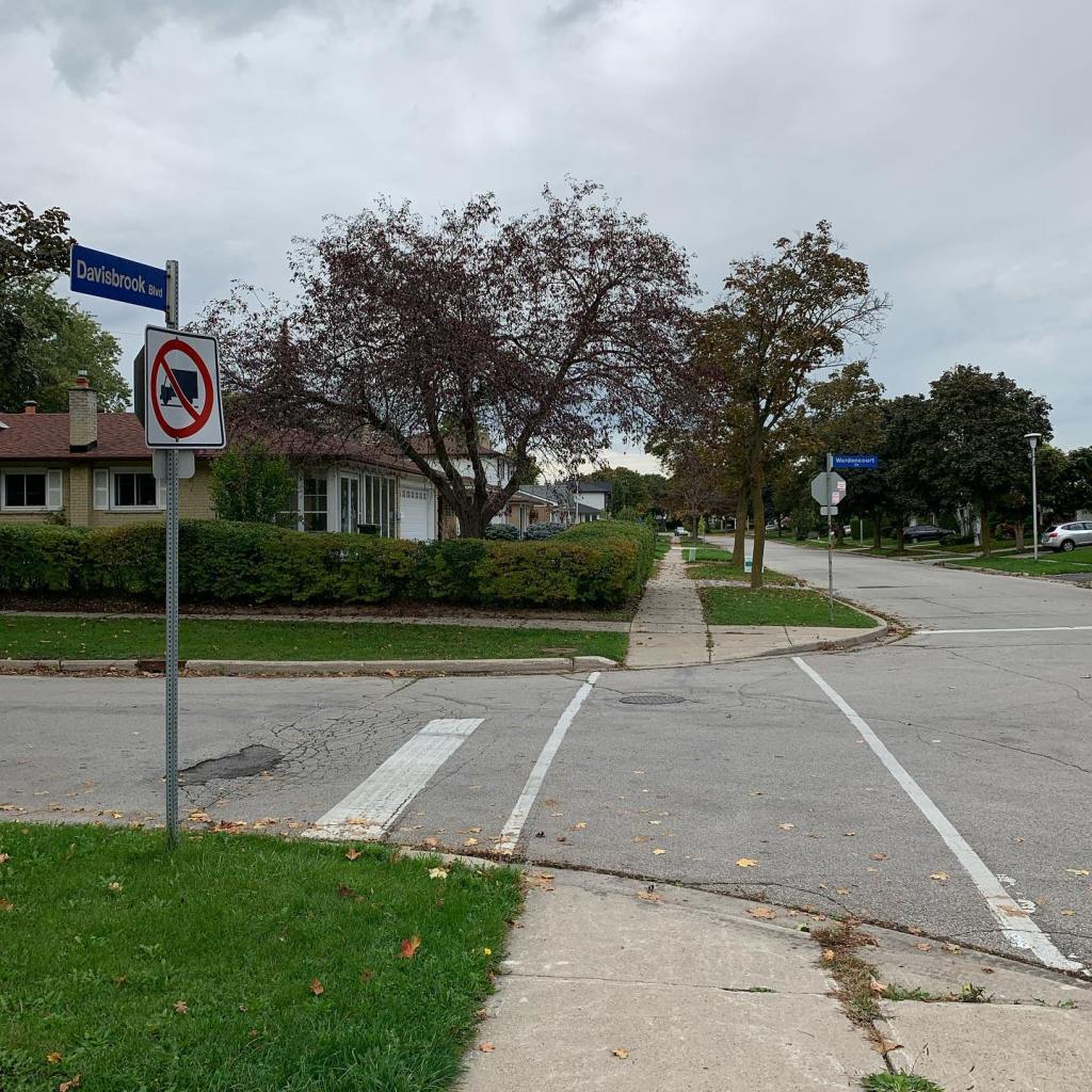 The walk along Davisbrook Blvd, and other streets in this area, generally feels safe and pleasant because of the grassy areas separating the sidewalks from the streets, as well as the abundance of trees. A particularly beautiful tree-lined street is Wardencourt Drive, which connects Davisbrook Blvd to Warden Avenue. According to the report, and illustrated by a photo on page 35, “Figure 5.1: Narrow Sidewalk Abutting Fast-Moving Traffic, Eglinton Avenue East near Markham Road”, many sidewalks in Scarborough do not feel safe, comfortable or pleasant.