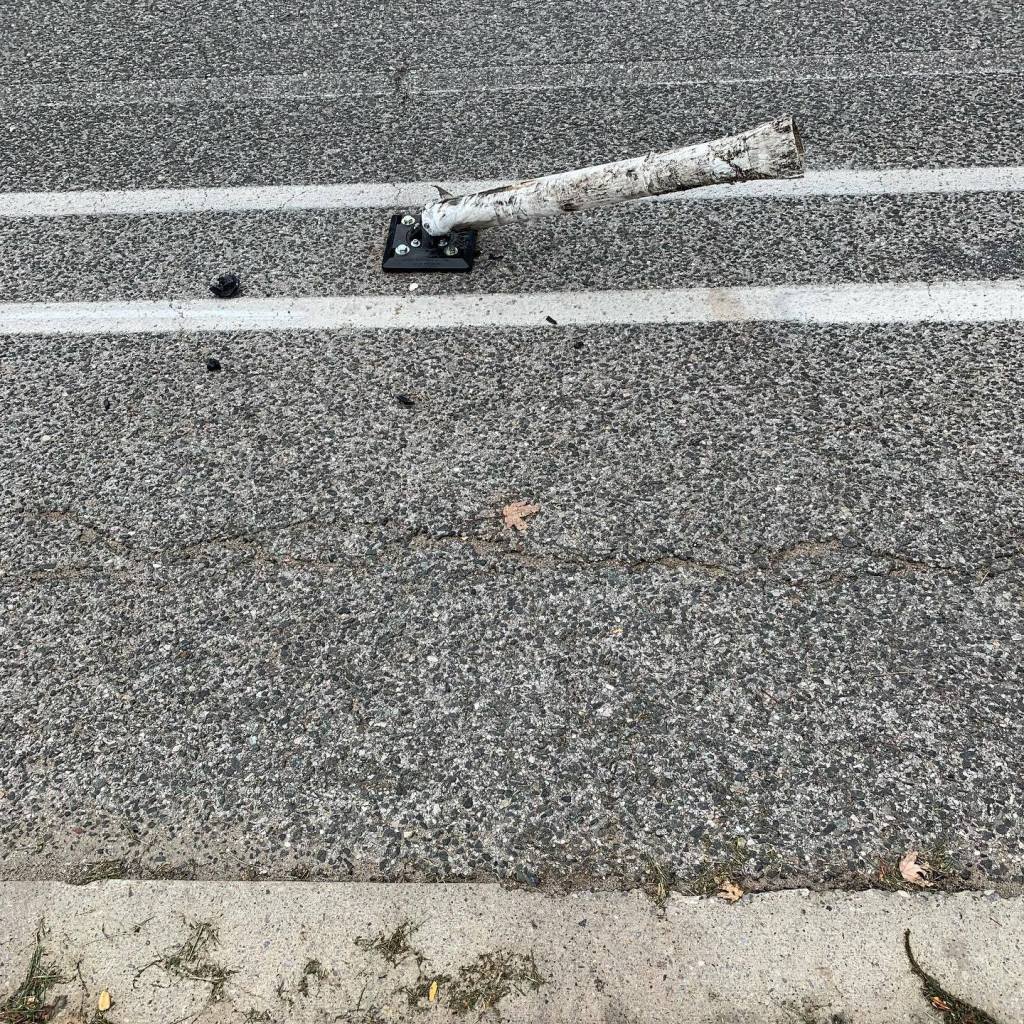 What happened here? This photo of a bent post on the cycle lane just east of where cars turn out of the parking lot at the Warden Plaza Shopping Mall onto Huntingwood Drive suggests that perhaps a motorist was going too fast and hit this post.