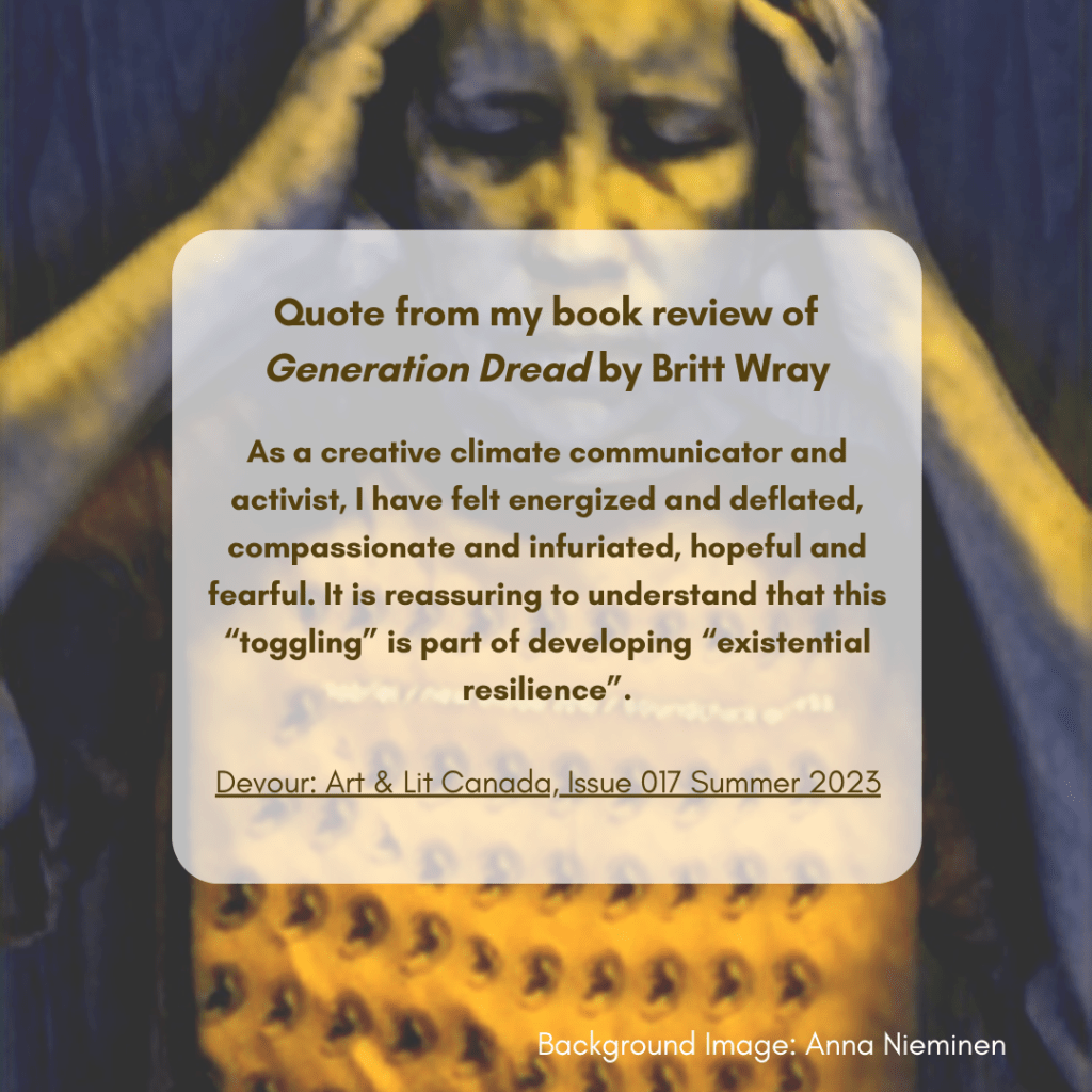Ahead of Youth Climate Action in Toronto‘s upcoming “Finding Purpose, Nourishment and Solidarity in the Age of Climate Crisis” event, which will include the launch of the paperback version of Britt Wray’s book Generation Dread: Finding Purpose in an Age of Eco-Anxiety, I present my book review and related found poem from my reading of the hardcover edition published in 2022.