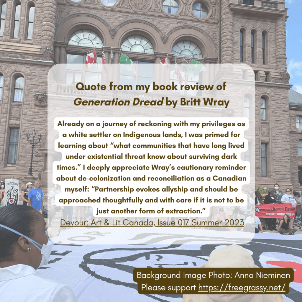 Generation Dread, interestingly, uses the metaphor of the potential power of billions of people understanding their “eco-distress as super-fuel” for shaping a future beyond our dependency on fossil fuels and entanglement in systems of oppression including colonialism and racism. Already on a journey of reckoning with my privileges as a white settler on Indigenous lands, I was primed for learning about “what communities that have long lived under existential threat know about surviving dark times.” I deeply appreciate Wray’s cautionary reminder about de-colonization and reconciliation as a Canadian myself: “Partnership evokes allyship and should be approached thoughtfully and with care if it is not to be just another form of extraction.”