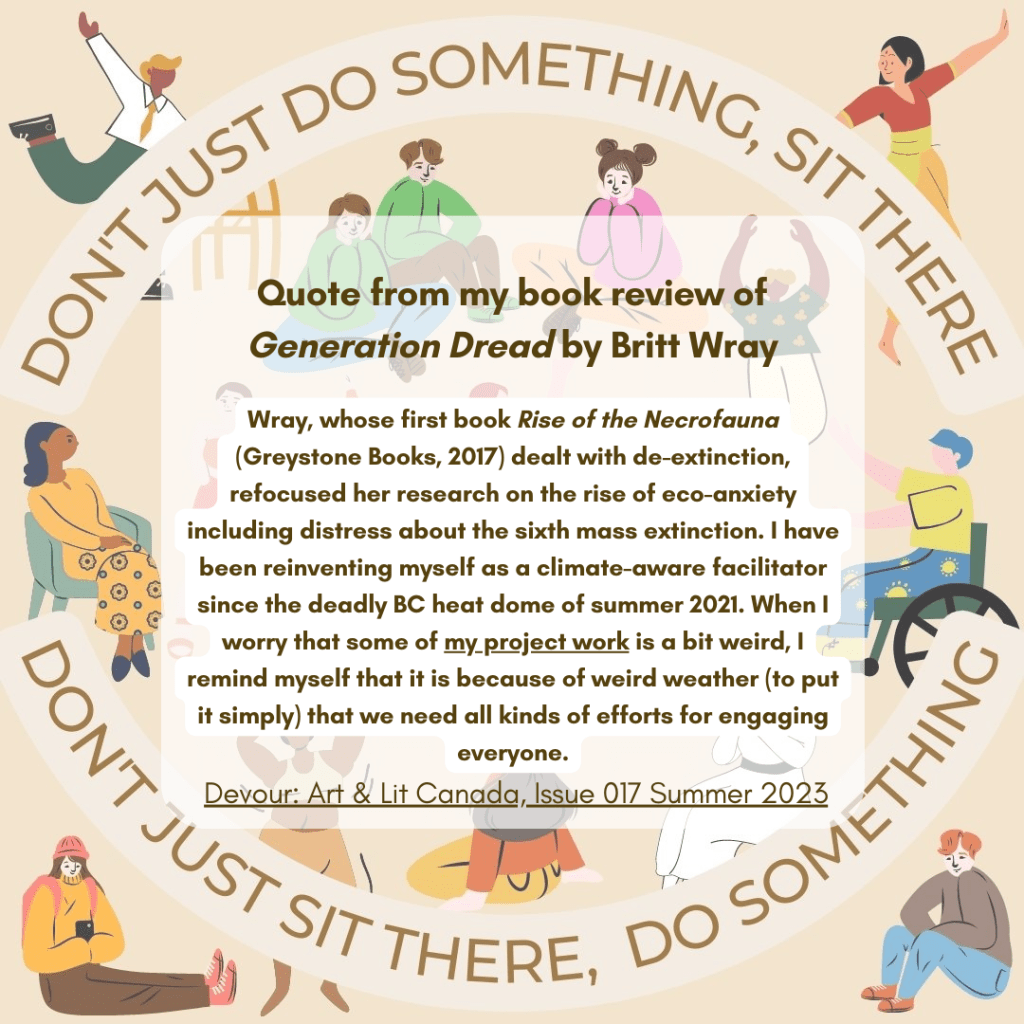 Generation Dread begins with Wray’s gripping story of reckoning with her eco-emotions as she and her husband faced a dilemma: would they bring a child into the climate crisis? Book and baby gestated and were birthed in tandem. Wray, whose first book Rise of the Necrofauna (Greystone Books, 2017) dealt with de-extinction, refocused her research on the rise of eco-anxiety including distress about the sixth mass extinction. I have been reinventing myself as a climate-aware facilitator since the deadly BC heat dome of summer 2021. When I worry that some of my project work is a bit weird, I remind myself that it is because of weird weather (to put it simply) that we need all kinds of efforts for engaging everyone.