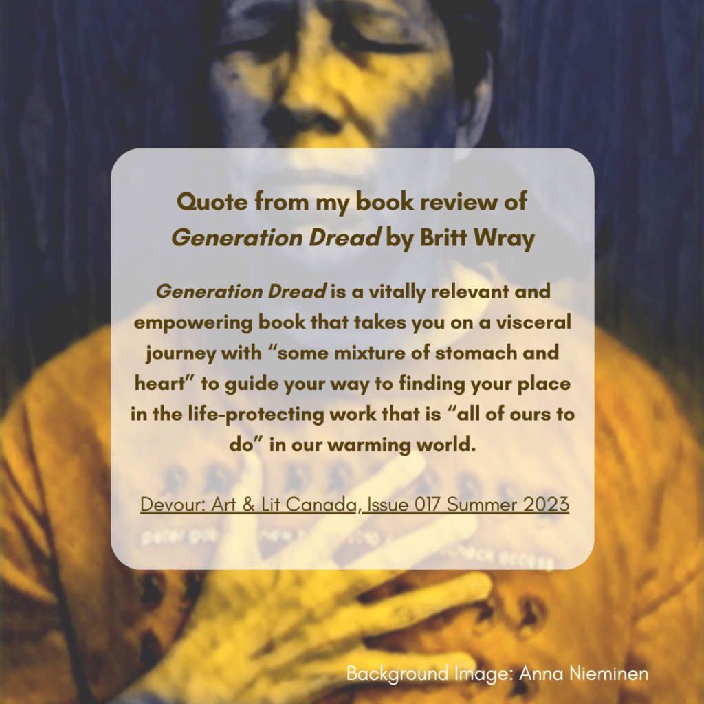 Below is a series of five images highlighting quotes from my review of Generation Dread, followed by the full text of the review. My thanks again to Devour: Art & Lit Canada for publishing my review this past August 2023. Finally, I present the found poem I created based on my book review. It was my pleasure to read this found poem at the Scarborough Poetry Club‘s “Poetry for a Warming World” public reading event at Agincourt Library in Scarborough, ON, this past September 2023.