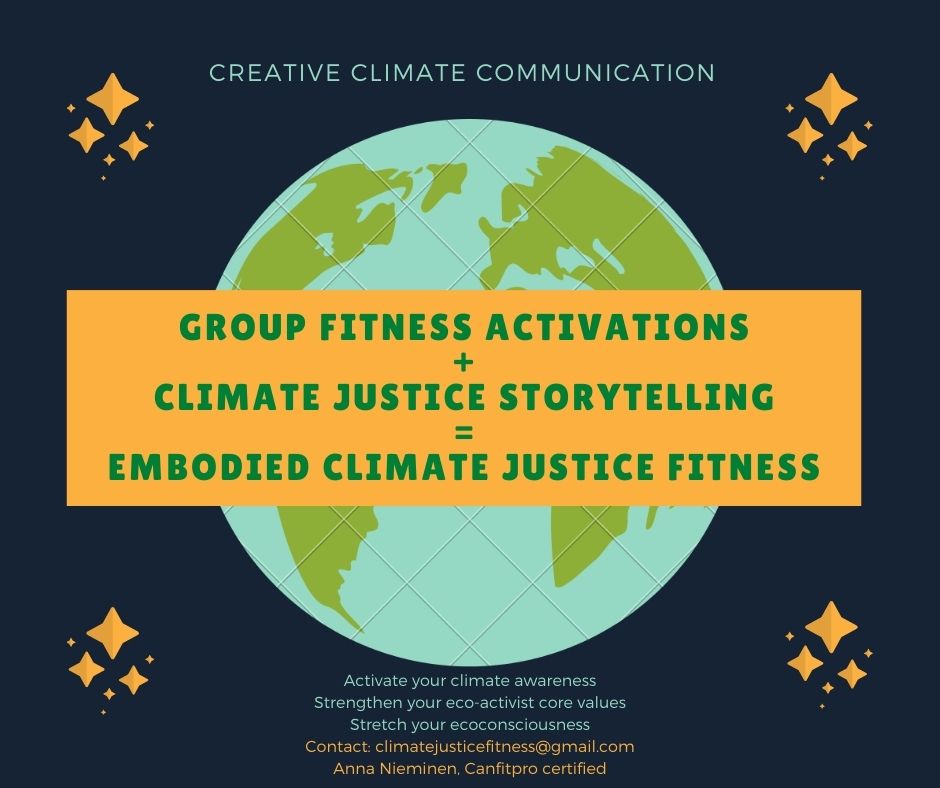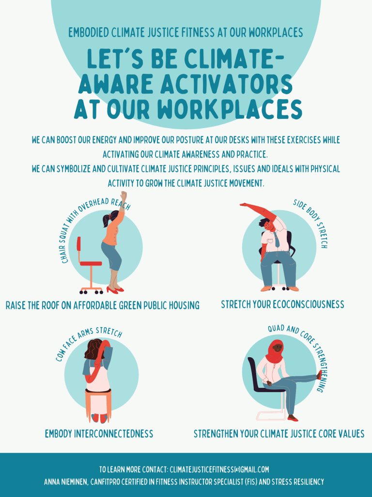 Here’s a poster about Embodied Climate Justice Fitness (ECJF) at our workplaces. You can email me at climatejusticefitness@gmail.com to learn more. Follow me on Instagram @annanieminenecjf
