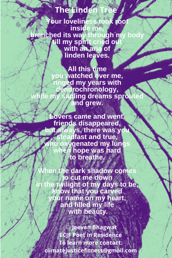 Introducing notes for my first Movement Arts Practice Piece, a 6min, mindful, climate-aware practice with the theme “Relating to and Protecting Trees”. This theme is inspired by the poem “The Linden Tree” by Jeevan Bhagwat, ECJF’s Poet in Residence. I invite you to follow along with the video on the Activations page (making any modifications you need to for yourself) and please feel free to contact me with any questions or feedback. You can email me at climatejusticefitness@gmail.com. Follow me on Instagram @annanieminenecjf