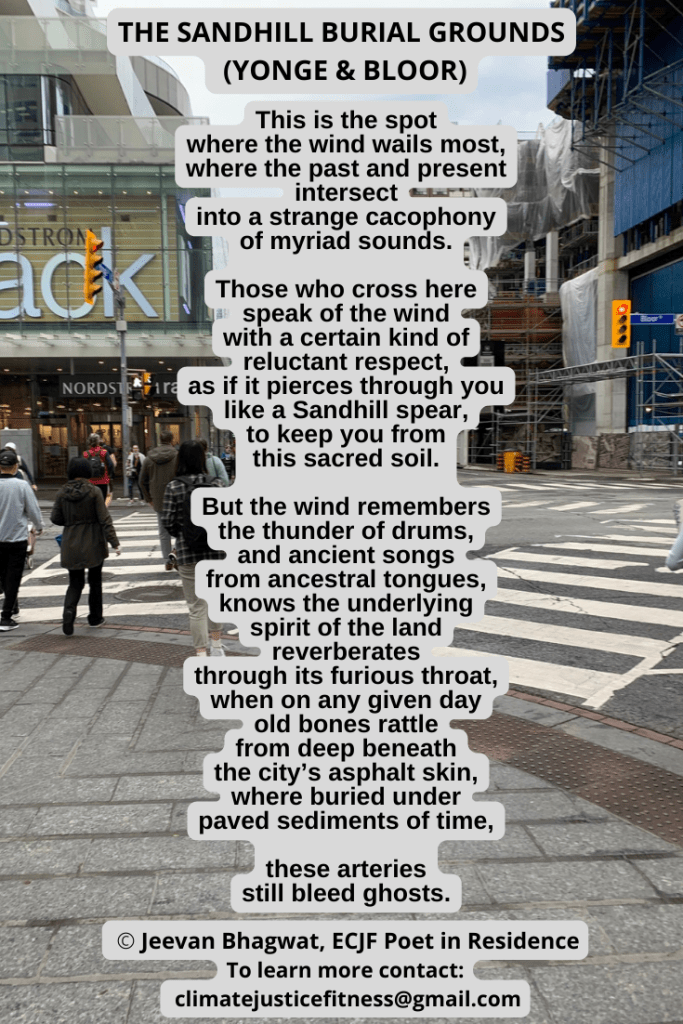 This third poem by Jeevan Bhagwat titled “The Sandhill Burial Grounds (Yonge & Bloor) ” brings to light a little know fact about local First Nations history below this busy Toronto intersection where “these arteries/ still bleed ghosts.” It was included among the poems read during the “Living in Indigenous Sovereignty” Poetry Walk lead by me, Anna Nieminen, during the Jane’s Walk Festival Toronto 2022 (and again in 2023). A self-guided edition of the poetry walk from 2022 can be accessed on my ECJF Blog page. – Anna Nieminen