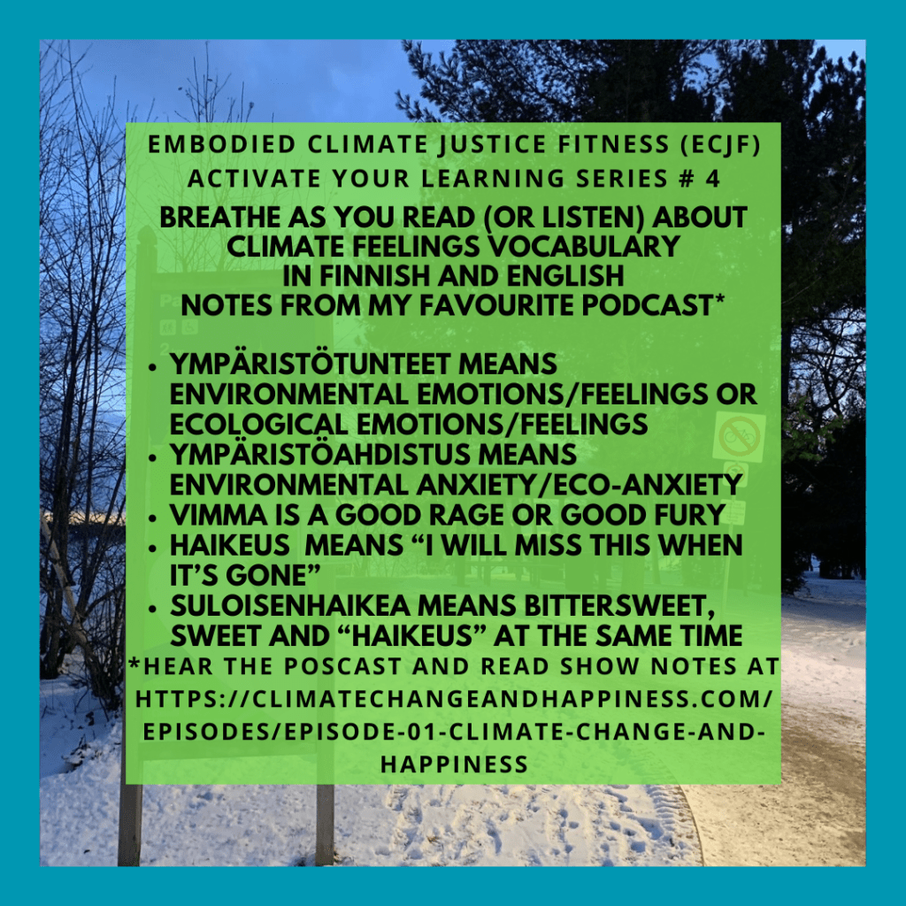 What is this Embodied Climate Justice Fitness (ECJF) website about? It’s a work in progress, a portfolio of sorts where I share about my journey as a climate-aware facilitator and creative climate communicator. I’m a fitness/movement arts facilitator, poetry group facilitator, and climate activist who is engaged in applying my learning and training in climate psychology and “internal activism”. This About page features poems, selected resources I’ve created to accompany my activations and selected climate communication graphics. You can find additional resources and news about my work on my Home page, Blog page, and Walking in “Indigenous Sovereignty” as a Settler-Ally page. Learn more about me on my Contact page and my Instagram account @annanieminenecjf I would love to hear from you with any comments or questions.