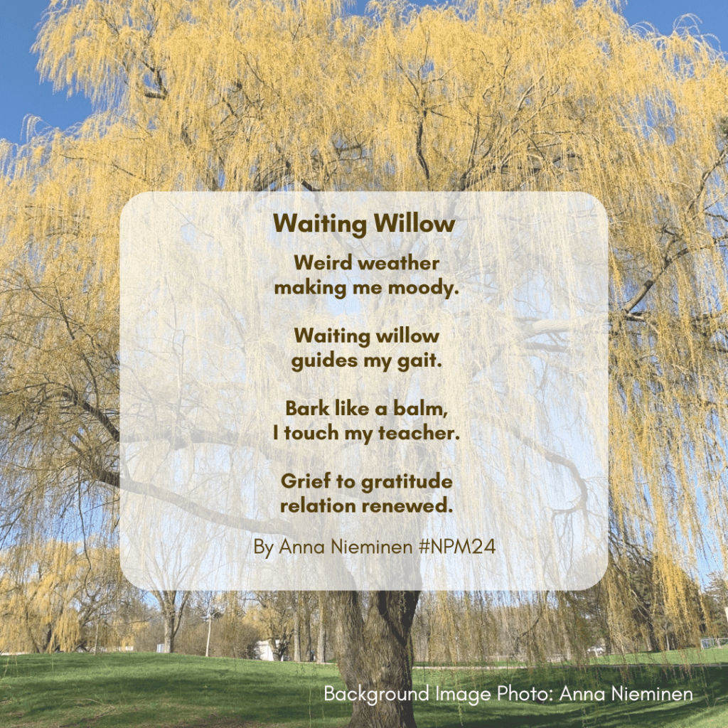 Featured below is my tribute poem “Waiting Willow”. You can read more about this poem in this blog post.