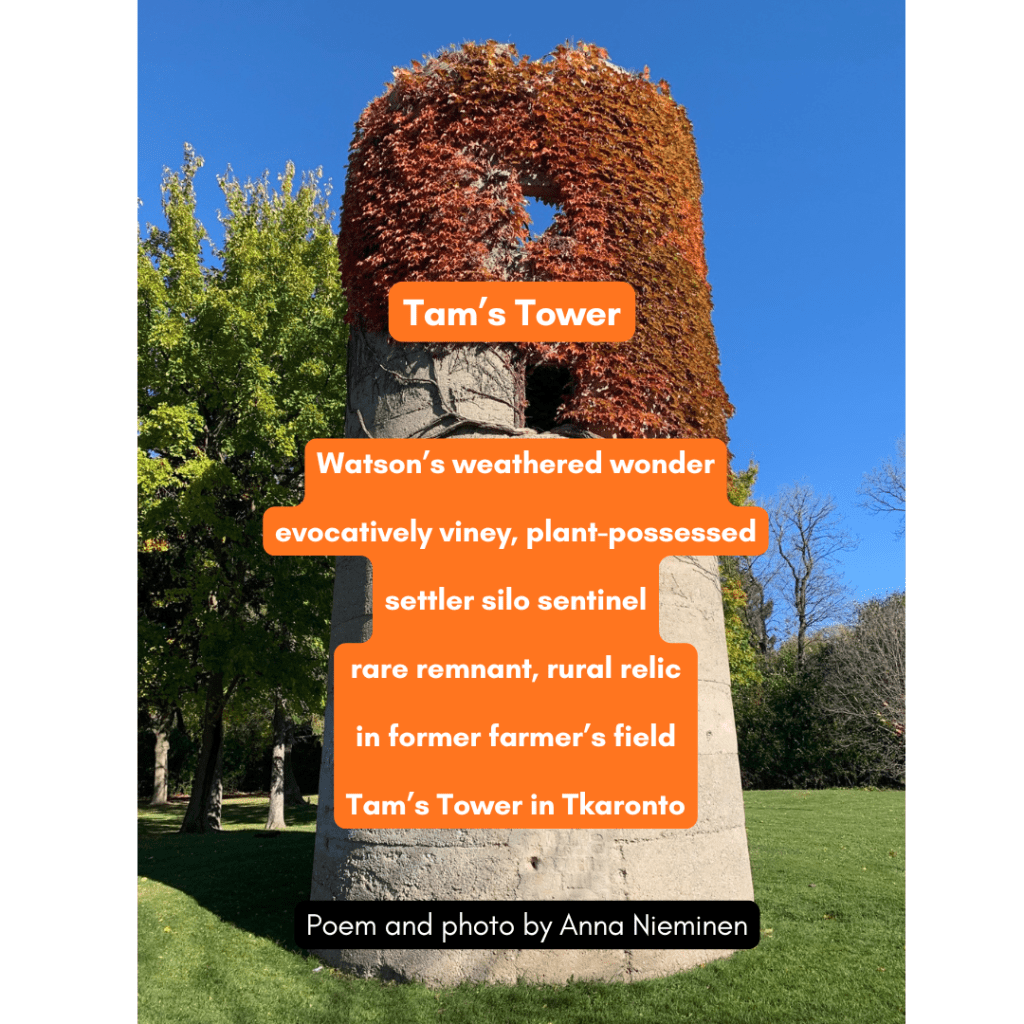Featured below is my tribute poem “Tam’s Tower”. It’s a tribute to the curious, plant-possessed tower in Ron Watson Park in Scarborough-Agincourt. The park is named for former City of Scarborough councillor Ron Watson (going back to pre-amalgamation with Toronto). The park was formerly named Tam O’Shanter Park, and the golf course to the north still bears that proper name. In the past, this park was the Charles Watson farm (no relation to Ron Watson). The poem ends with a land acknowledgement with the reference to “Tkaronto”. I debuted this poem during the Scarborough Poetry Walk in Ron Watson Park that I led as part of the Jane’s Walk Toronto Festival on Sat May 3, 2025. I also shared this poem during the Scarborough Poetry Club‘s 10th anniversary celebration at Agincourt Library on Sat Oct 4, 2025. Earlier that week on Wed Oct 1, I shared this poem at the open mic during “We Create Our Futures” at the Centre for Social Innovation in Toronto.