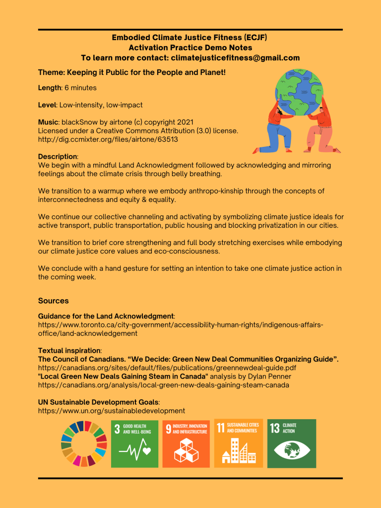 Introducing notes for my first Activation Practice Demo, a 6min, mindful, climate-aware fitness practice with the theme “Keeping It Public for the People and Planet!”. This theme is inspired by the Council of Canadians’ “We Decide: Green New Deal Communities Organizing Guide“. I invite you to follow along with the video below (making any modifications you need to for yourself) and please feel free to contact me with any questions or feedback. You can email me at climatejusticefitness@gmail.com. Follow me on Instagram @annanieminenecjf