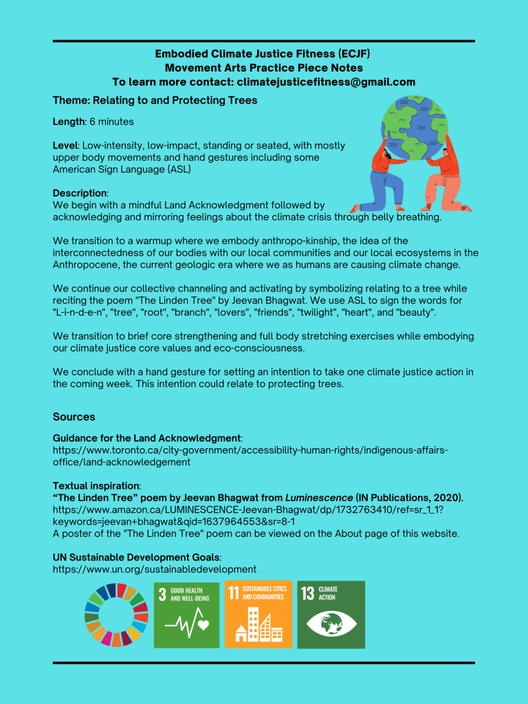 Introducing notes for my first Movement Arts Practice Piece, a 6min, mindful, climate-aware practice with the theme “Relating to and Protecting Trees”. This theme is inspired by the poem “The Linden Tree” by Jeevan Bhagwat, ECJF’s Poet in Residence. I invite you to follow along with the video below (making any modifications you need to for yourself) and please feel free to contact me with any questions or feedback. You can email me at climatejusticefitness@gmail.com. Follow me on Instagram @annanieminenecjf